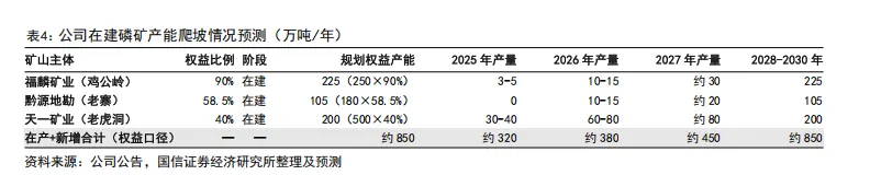磷矿石是公司“矿化一体”布局的核心资源基础,公司通过控股福麟矿业、黔源地勘及参股天一矿业,掌控小坝磷矿、新桥磷矿、老虎洞磷矿等优质资源。公司控股子公司福麟矿业拥有小坝磷矿、新桥磷矿及鸡公岭磷矿,控股子公司黔源地勘拥有老寨子磷矿的采矿权,参股公司天一矿业拥有老虎洞磷矿。目前年开采能力约 320 万吨,2025 年上半年实际开采 154.10 万吨,其中 29.21 万吨对外销售,其余用于内部生产自给,资源自给率行业领先。该业务 2025 年上半年实现营收2.33 亿元,毛利率高达 81.21%,是核心利润来源之一。当前鸡公岭磷矿、老寨子磷矿、老虎洞磷矿正处于建设期,2028 年之前的部分磷矿石增量主要可用于磷化工生产自给,预计 2028 年后公司磷矿石年产能将达 850 万吨,保障原料充分自给的同时也具备外销增加的能力,成本优势与产业链掌控力将进一步强化。权益储量约3.66 亿吨,产能320万吨-2025年,850万吨-2028年