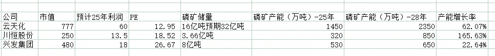 预计2025年18亿利润,2026年25亿利润。480亿市值,2025年PE对应26倍综合对比,单纯看磷矿方面:云化天相对稳定一点,且有磷矿并入上市公司的预期。川恒产能增长速度较快,弹性会更好。