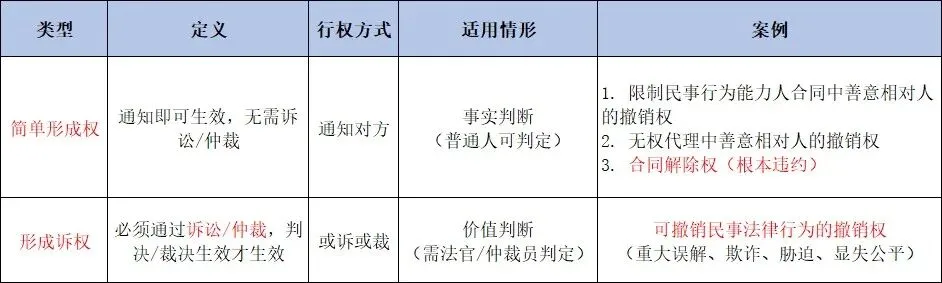 【补充】合同解除权=事实判断(如房屋主体结构质量不合格,普通人可鉴定);可撤销权=价值判断(欺诈、重大误解需专业判定)