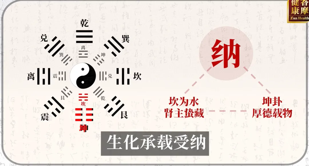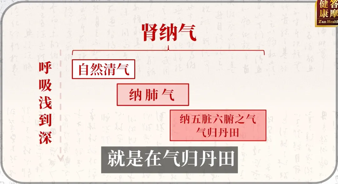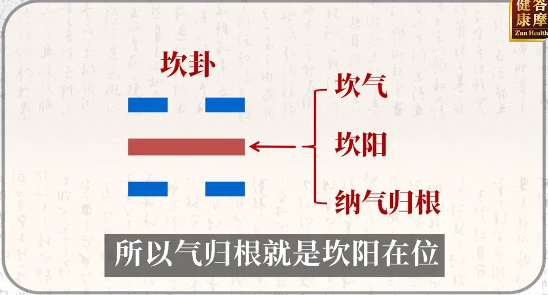 气需归元至人体下部(丹田),坎阳与肾阳同义,纳气即气归根。气海、石门、关元都叫丹田,纳气归元的地方就是丹田。越老呼吸越浮,练腹式呼吸可复归婴儿态,逆天延缓衰老。腹式呼吸:一种以横膈膜为主要动力的深层呼吸方式,简单说,吸气时鼓肚子,呼气时收肚子。【拓展】:梁冬老师分享了有一次在道观里,道长让他吸气的时候,拿手摁住下丹田,一直往里摁,一直往里吸,数36下,憋不住了,啪一放,气血一下到下丹田。提前是人心肺功能没有器质性病变。【养生妙招】:踵息,出自《庄子·大宗师》——“真人之息以踵”(意思是修行高深的人呼吸深沉,气息直达脚跟)。它指呼吸极深、极细、极长,引导注意力下沉至脚底的状态。所以,我们呼吸的时候踮踮脚,让气引到脚底。表现为呼多吸少、动则气喘,可通过冬虫夏草、蛤蚧配人参、核桃仁、沉香、磁石等调理。以后天八卦为主,先天八卦为背景。后天八卦里坎在最下面,对于先天八卦最下面的坤卦。坎卦(肾阳)主纳气,坤卦(厚德载物)主承载收藏。肾不仅收纳阳气,更有坤土般生化承载之力,火容易没有土包着,容易散,故补肾需兼顾温阳与健脾(如四逆汤用干姜炙甘草)。