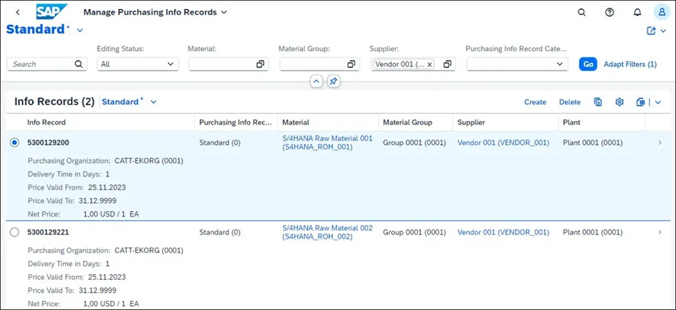 SAP S/4HANA 中也提供了新的 管理信息记录app,它允许维护购买信息记录。如下图所示,此应用程序显示信息记录列表,还可以创建、更改、显示或删除特定的信息记录。