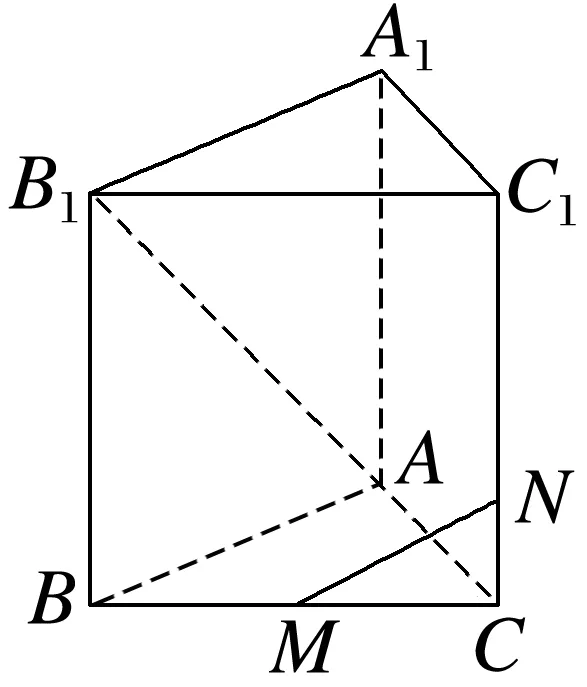 例1 如图,已知正三棱柱ABC-A1B1C1的各棱长都为1,M是底面上BC边的中点,N是侧棱CC1上的点,且CN=14CC1.求证:AB1⊥MN.
