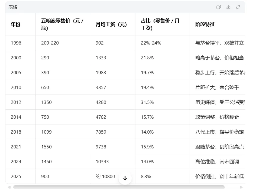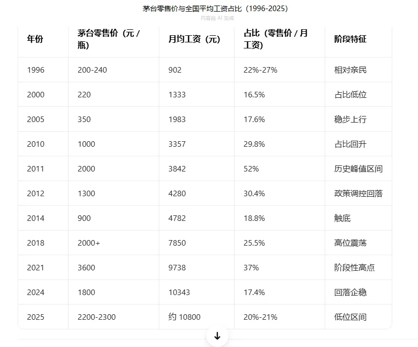 那么,茅台为什么能一直涨价,大周期看,和人均工资收入有相关性,小周期看,和经济周期呈现结构性相关,下表是过去30年,茅台酒的零售价和月均工资的占比。
