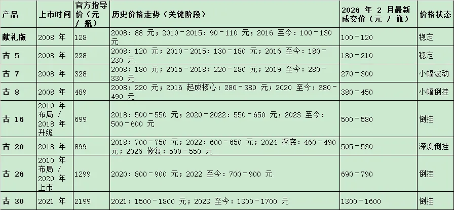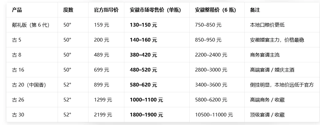 这样公司就有2条高端战线,对于消费者就会比较糊涂,不知道选哪个好?所以,公司在2008年合并了这两条战线。名称也简化为古5、古8、古16、古20等,2026-02月,在安徽的价格如下表: