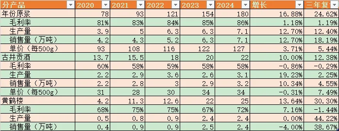 年份原浆2024年收入180亿,占全部收入的76%,是核心产品,三年复合增速为24%,销售量的增速是18%,主要是量增,其次是价增。每500g的公司销售单价复合增长为5%。年份原浆的平均出厂价只有127元/500g,这个好像有主观印象不一样,古20占1/3的销售额,古20的出厂价怎么也得400元吧?去互动易问问。