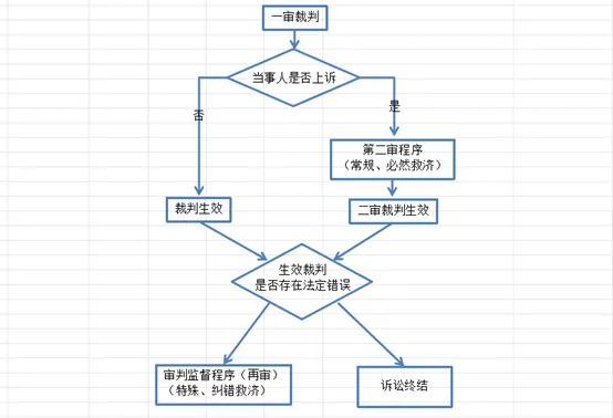 启动 | 当事人提起上诉(一审原/被告、有独三、判决承担义务的无独三) | 三种途径:1.法院依职权决定再审;2.检察院提出抗诉或检察建议;3.当事人申请再审 |