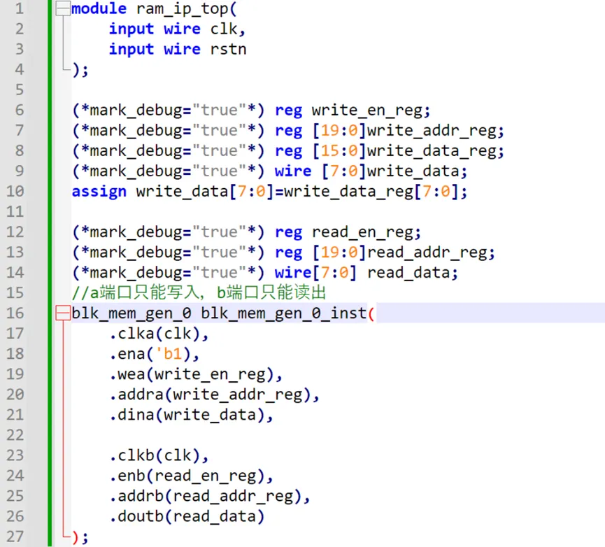 单口RAM只有一个端口(A端口),可以对A端口进行读写。