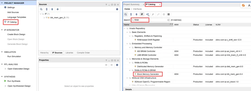 打开IP Catalog,在Search输入RAM,下拉找到Block Memory Generator,双击这个IP核就可以打开IP,然后进行配置和调用IP;