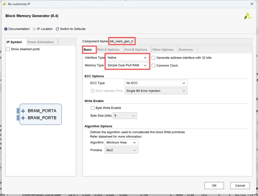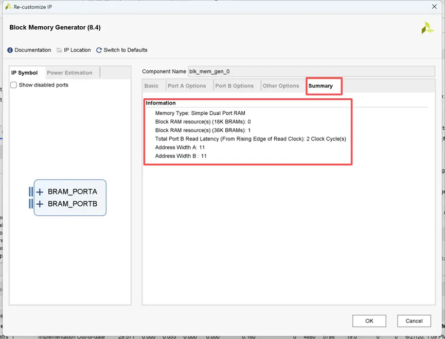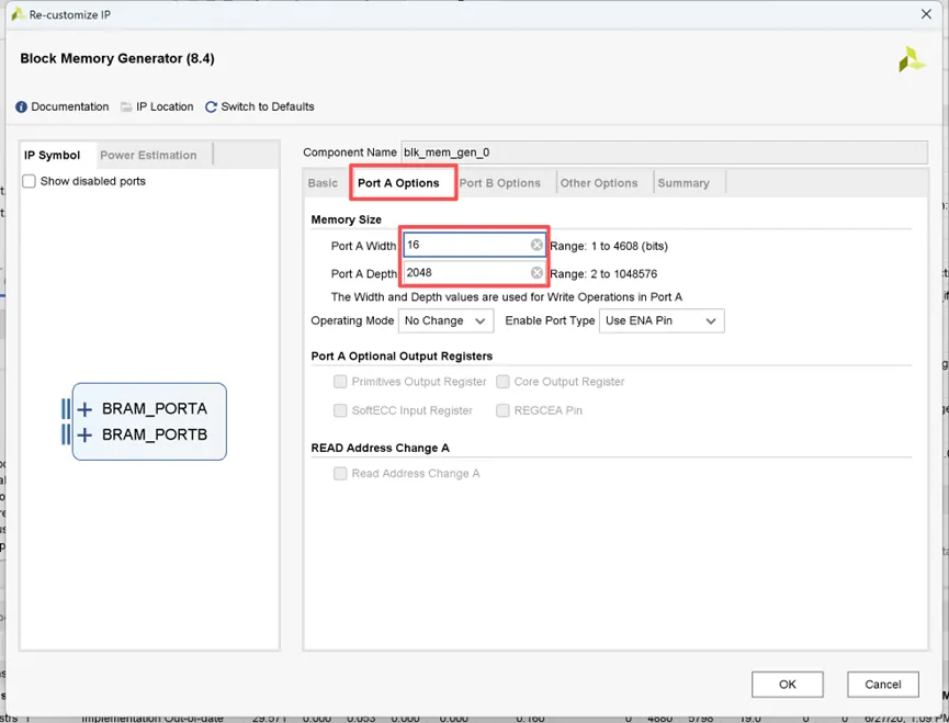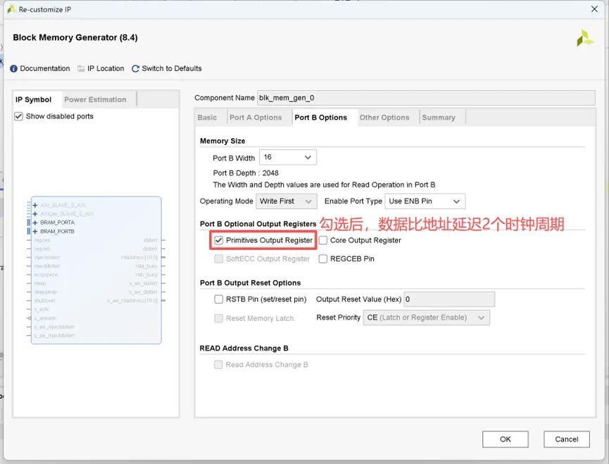 Port B options设置:一般是A设置好了,B配置默认一致;需要注意的是,如果勾选Primitive Output Register选项,则数据会比地址延迟2个时钟周期;