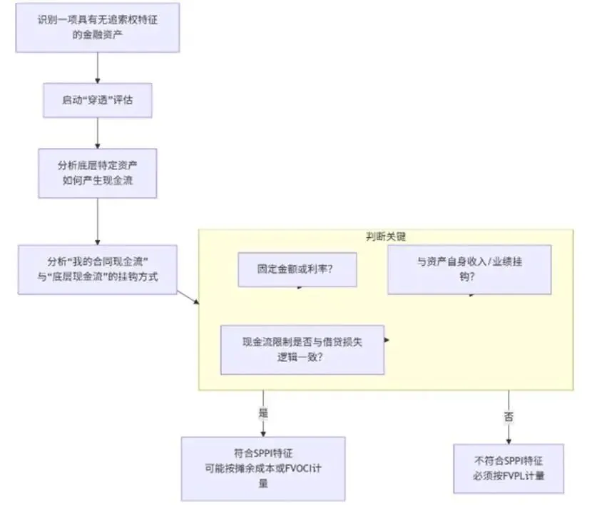 触发“穿透评估”要求:以判断合同现金流的经济实质是否仍代表“本金和利息”(SPPI)。如果不能通过SPPI测试,则必须按公允价值计量且其变动计入损益(FVTPL)。不能只看手里那份“借款合同”,必须穿透去看底层资产(如收费公路)是如何产生现金流的,以及合同现金流是如何与底层现金流挂钩的(是固定的“过路费”吗?还是浮动的“收入分成”)。