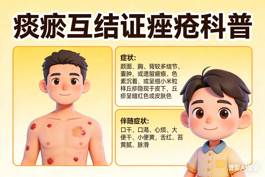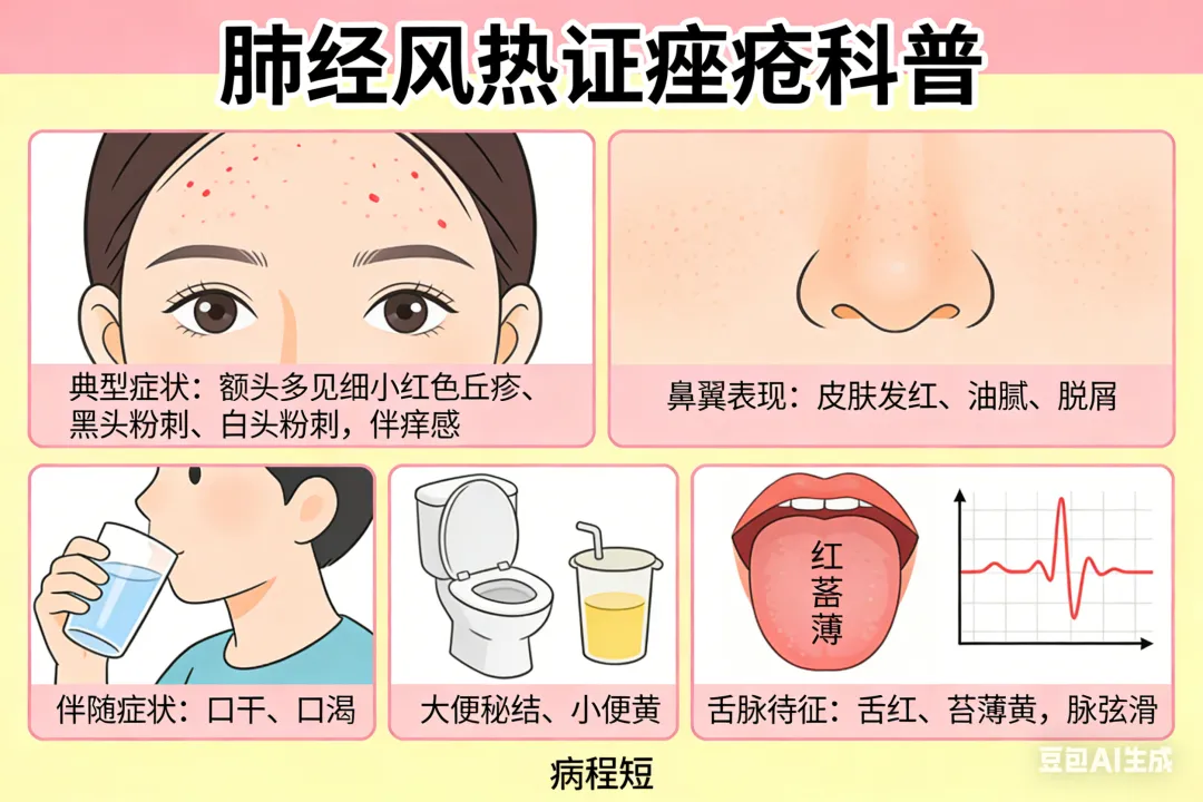 《中西医专家帮您解读痤疮》这本书中提到,痤疮的病因病机可归纳为肺经风热证、胃肠湿热证、痰瘀互结证、冲任失调证及阴虚火旺证。临床中,绝大多数患者并非患单纯一种痤疮,可能同时出现丘疹、囊肿和结节,并且会随着病情的发展相互转化。(1)肺经风热证:症见颜面细小红色丘疹、黑头粉刺、白头粉刺,以额头多见,常伴有痒感,鼻翼两旁皮肤发红、油腻、脱屑,兼见口干、口渴,大便秘结、小便黄,舌红、苔薄黄,脉弦滑,病程短。(2)胃肠湿热证:症见颜面、胸、背较大的红色丘疹,有的呈结节、脓疱,甚痒,常伴有身困、纳食欠佳、口干、便秘、尿赤、白带多、舌红、苔黄腻、脉弦数或滑数、病程可长可短。(3)痰瘀互结证:症见颜面、胸、背较多的结节、囊肿,或遗留瘢痕、色素沉着,或呈细小米粒样丘疹隐现于皮下,丘疹呈暗红色或皮肤色,伴有口干、口渴、心烦、大便干、小便黄、舌红、苔黄腻、脉滑。(4)冲任失调证:见于女子,面部皮损的发生和轻重与月经周期有明显的关系。月经前皮疹明显增多、加重,月经后皮疹减少、减轻,或伴有月经不调、月经量少、经前心烦易怒、乳房胀痛等。舌红、苔薄黄,脉弦细数。(5)阴虚火旺证:多见于青春期后女性,皮疹反复发作,尤其月经来潮前增多,好发于下颌、口周等处,色红或暗红,伴月经量减少、口渴、潮热,舌红、少苔,脉细数。痤疮在面部位置不一样,如何重脏腑、重经络?
