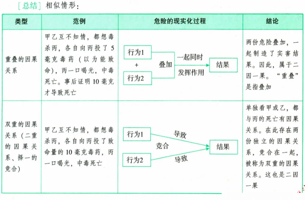 刑法上因果关系的“果”是实害结果,不包括危险状态。实害结果必须是现实发生的结果,不包括假设的结果。假设的结果与行为之间的因果关系被称为假设(假定)的因果关系,这种因果关系不是现实的因果关系,不被采纳。 重叠的因果关系,只有一份因果关系制造了实害结果;双重的因果关系有独立的两份因果关系制造实害结果。 第一,相同点:如果没有其中一个行为,另一个行为也会导致死亡结果发生。