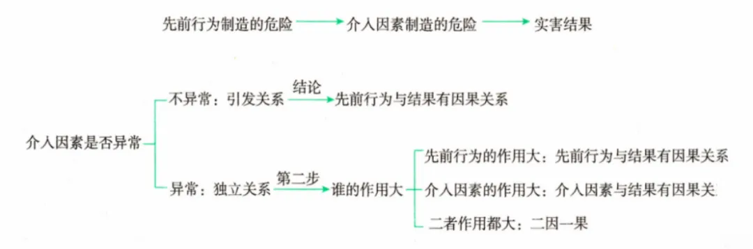 危险的现实化理论认为,应根据充分条件来论证因果关系,在论证“A即B因”上,“有A则有B”比“无A则无B”的理由更充分。按照充分条件,行为制造的危险现实化为结果,结果才能归属于行为。这是目前法考的理论观点。这种充分条件,也被称为合法则的条件,意指危险流的实现符合自然法则、经验法则。 存在介入因素的案件中,危险现实化理论的判断重点是,结果是先前行为制造的危险的现实化结果,还是介入因素制造的危险的现实化结果,抑或是二因一果。对此可根据“介入因素两步走”标准判断。 【注意】判断介入因素的异常性,需要注意一般化与具体化的区别(即概率大小)。 (1)介入因素不异常,表明先行行为与介入因素具有引发关系。结论:先前行为与结果有因果关系。 这是指,先前行为引发了介入因素,介入因素的出现不异常,因此,先前行为应对介入因素的出现负责,应对介入因素导致的结果负责。至于结果与介入因素有无因果关系,需要另行判断;若有因果关系,则属于二因一果。 (2)介入因素异常,表明先前行为与介入因素是独立关系。 这是指,介入因素的出现不是先前行为引发的,先前行为对介入因素的出现不用负责,表明二者是独立关系。 2.第二步:判断谁的作用大?