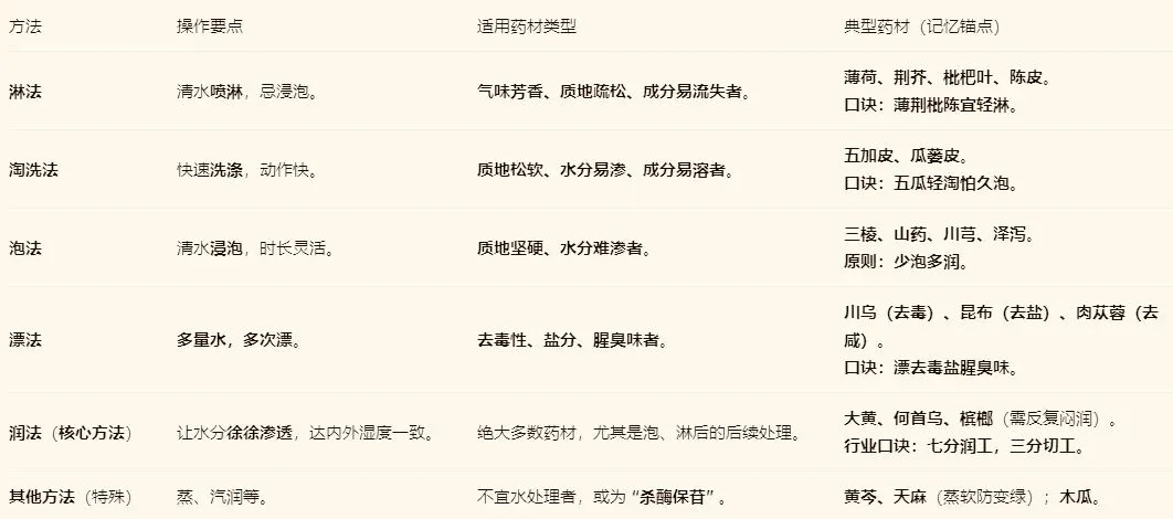 (2)淋、淘用于怕久泡的药材;泡、漂用于难软或需特殊处理的药材;润是通用且关键的步骤。