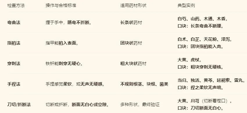 3.检查靠手感:将五种“看水性”方法与对应的药材形状联系起来(如长条弯、团块掐、粗块刺)。