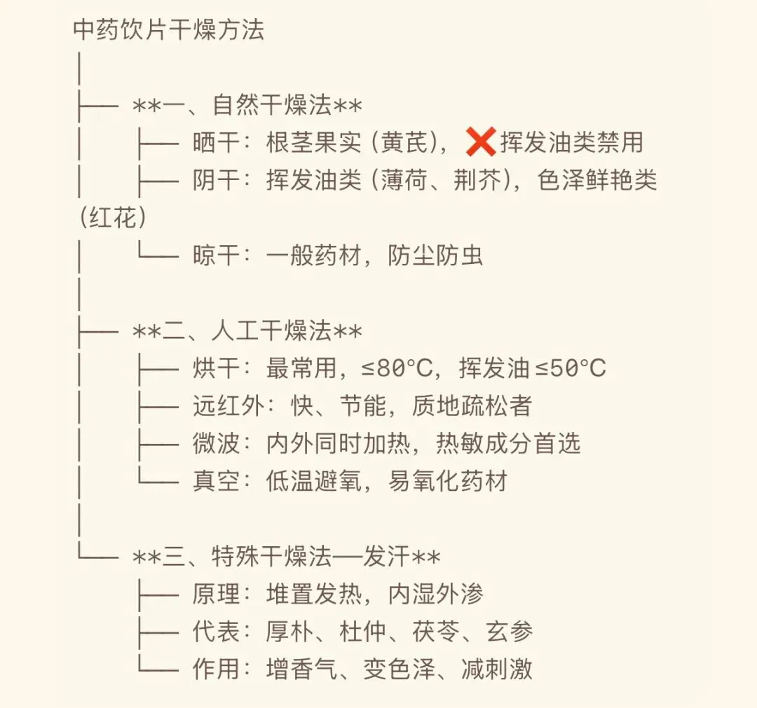 5.干燥控温度:区分自然干燥的适用对象,并牢记人工干燥的温度上限(一般80℃,挥发油50℃)和晾凉后贮存的关键细节。