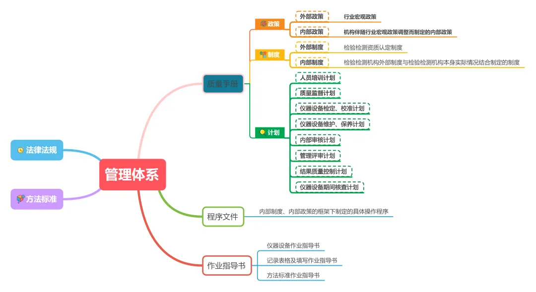 这一小条款给出了管理体系建立的依据,包括法律法规和标准(规范),法律法规在学习笔记(一)中已经进行了梳理,这里不再进行赘述,管理体系的建立首先要学习所依据的法律法规;标准(规范)这里指的是所开展的检验检测使用的标准或者规范,管理体系的建立同样也需要进行标准规范的学习,在学习完以上两个部分后,就可以对管理体系文件进行构思和编制了,具体怎么进行构思和编制呢?这一小条款下面给出了纲领性的几部分,包括了政策、制度、计划、程序和作业指导书。