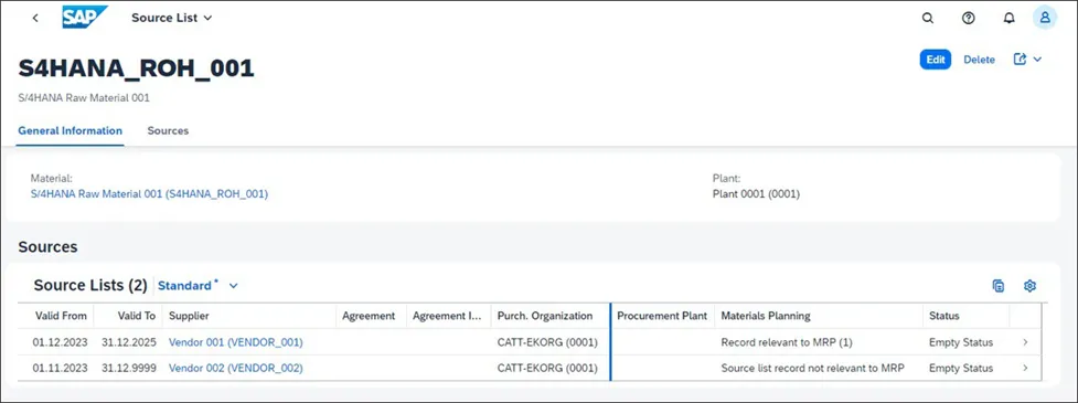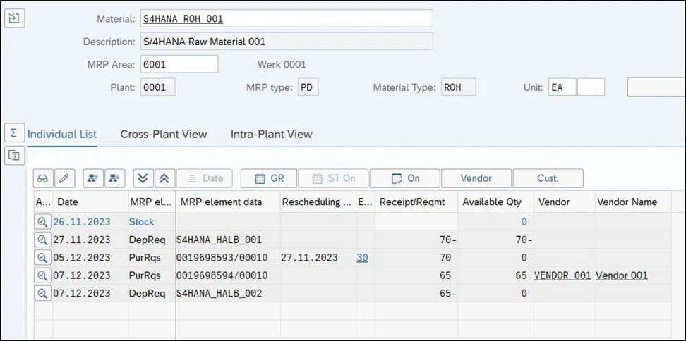 下图显示了物料 S/4HANA_ROH_001 的 MRP 运行结果,其中 2023 年 11 月 27 日的要求导致短缺,而 2023 年 12 月 7 日的另一项要求导致另一次短缺。考虑到该材料的货源清单(如下图所示),有效供应来源的有效期开始日期为 2023 年 12 月 7 日。