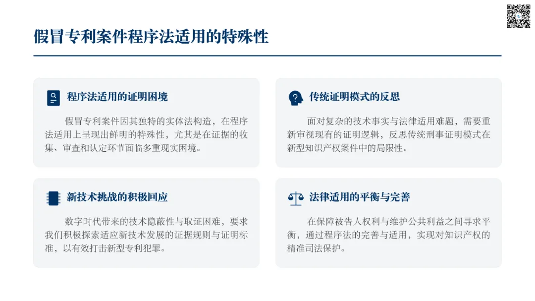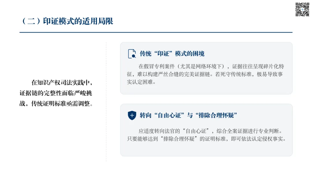传统的刑事诉讼证明过度追求证据之间的绝对“印证”,要求证据链条环环相扣、严丝合缝。然而,在假冒专利案件中,尤其是在网络环境下,行为隐蔽、证据分散、电子数据易篡改,难以构建完美的印证体系。例如,在认定“非法经营数额”时,可能仅有部分销售记录、不完整的电子账单或零散的物流信息。若机械追求印证,将导致大量案件因“证据不足”而无法追诉。因此,应承认法官在综合全案证据基础上的自由心证,只要其通过审慎判断能够达到“排除合理怀疑”的证明标准,即可认定案件事实。这种从“印证”到“心证”的适度转向,更契合假冒专利案件的证明实际。