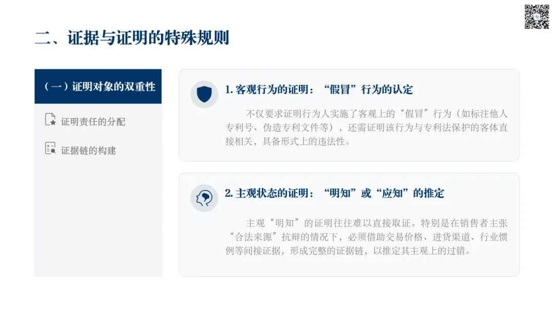 假冒专利罪的成立,不仅要求证明客观的“假冒”行为(如在产品上标注他人专利号),还须证明主观上的“明知”或“应知”。对于前者,实物证据(如假冒产品、包装、宣传册)往往较为直观。但对于后者,特别是在销售者“不知道”是假冒产品并能证明合法来源的免责情形下,如何证明其主观状态成为难题,往往需要借助间接证据形成证据链。