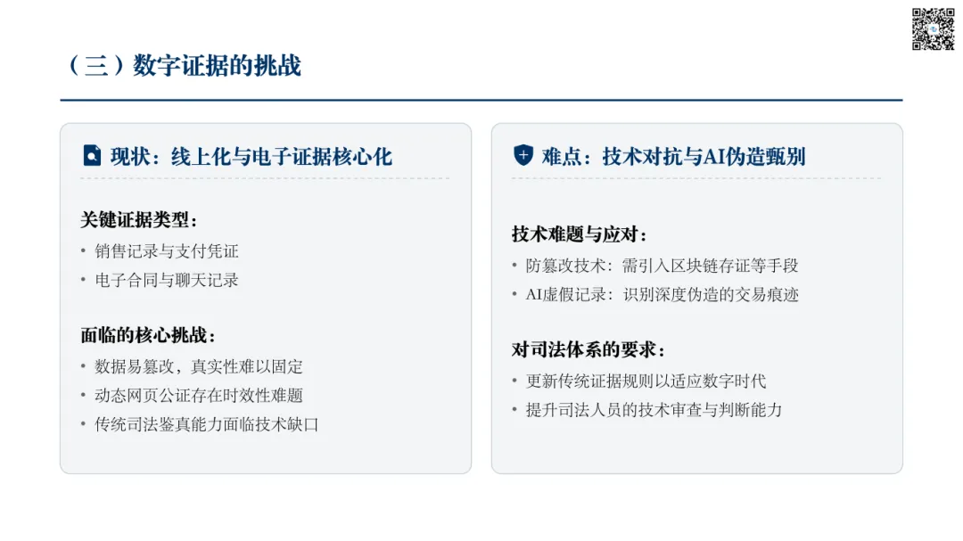 电子商务的普及使得假冒专利行为大量转移到线上。电子证据,如网店销售记录、电子合同、网络支付凭证、网页截图、即时通讯记录等,成为关键证据。然而,电子证据的收集、固定、保全与鉴真面临技术难题。例如,如何确保从电商平台调取的后台数据不被篡改、如何对动态网页进行有效公证、如何甄别利用AI技术生成的虚假交易记录等,都对传统的证据规则和司法人员的专业能力提出了挑战。这些实践难题也催生了诉讼证明理论的新发展,例如关于电子证据鉴真规则的细化、区块链存证技术的司法应用等。