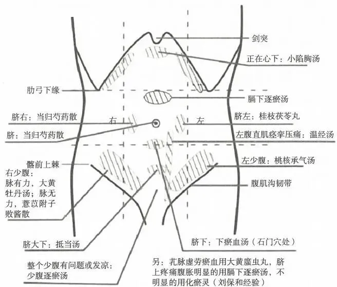 临床思路应该是:先通过问诊和脉诊确定属于哪一经的病(如少阳病、厥阴病),开出主方。然后在腹诊时发现有瘀血点,就在主方的基础上,合上对应的祛瘀血方。