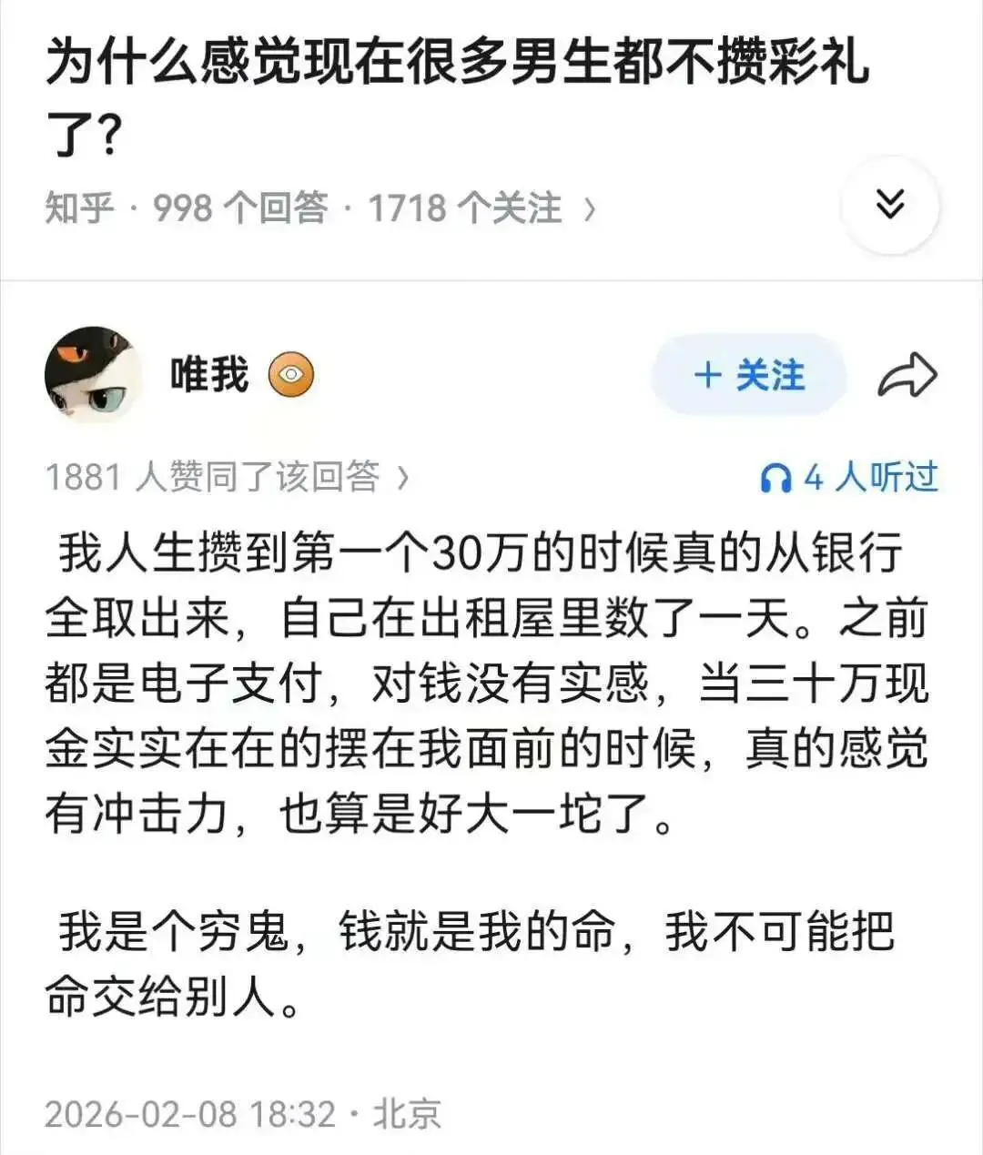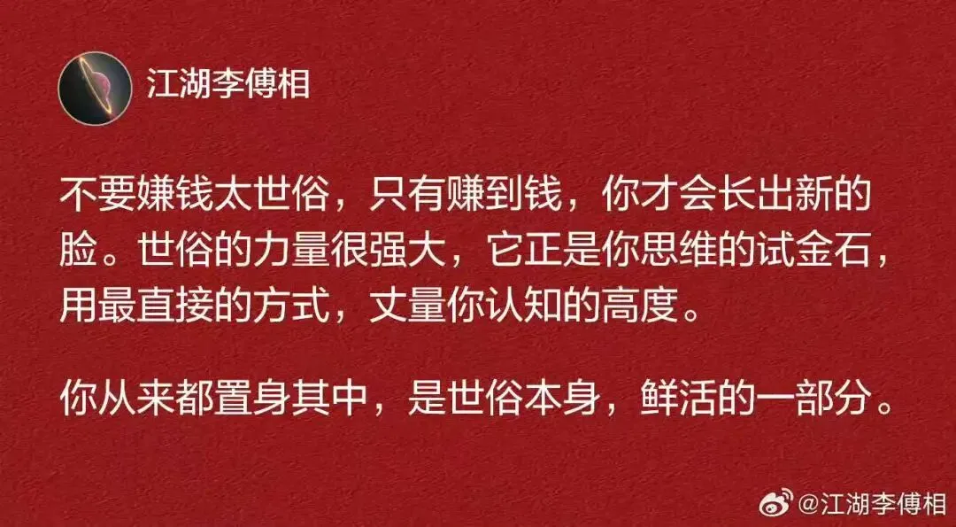 我觉得做任何事情先不要想着马上赚钱,先一点点打磨好。真的等我们把事情做好,把产品做好,把内容做好,钱自然就来了。越急着赚钱越赚不到钱。