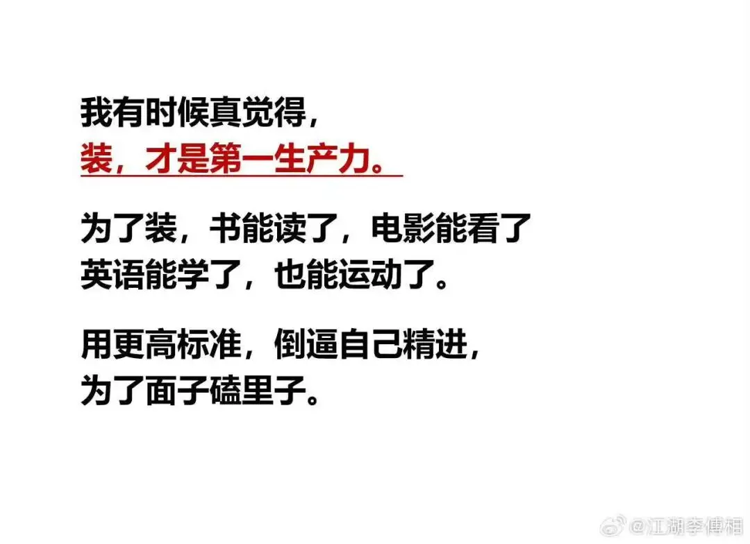 最近我自己懈怠了一阵子,更深刻感受到:还能坚持打扮、把自己收拾漂亮的人,本质上都是心里还爱着名利场、还对生活有欲望的人。