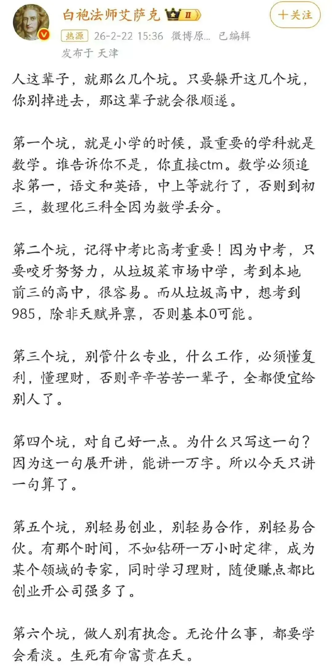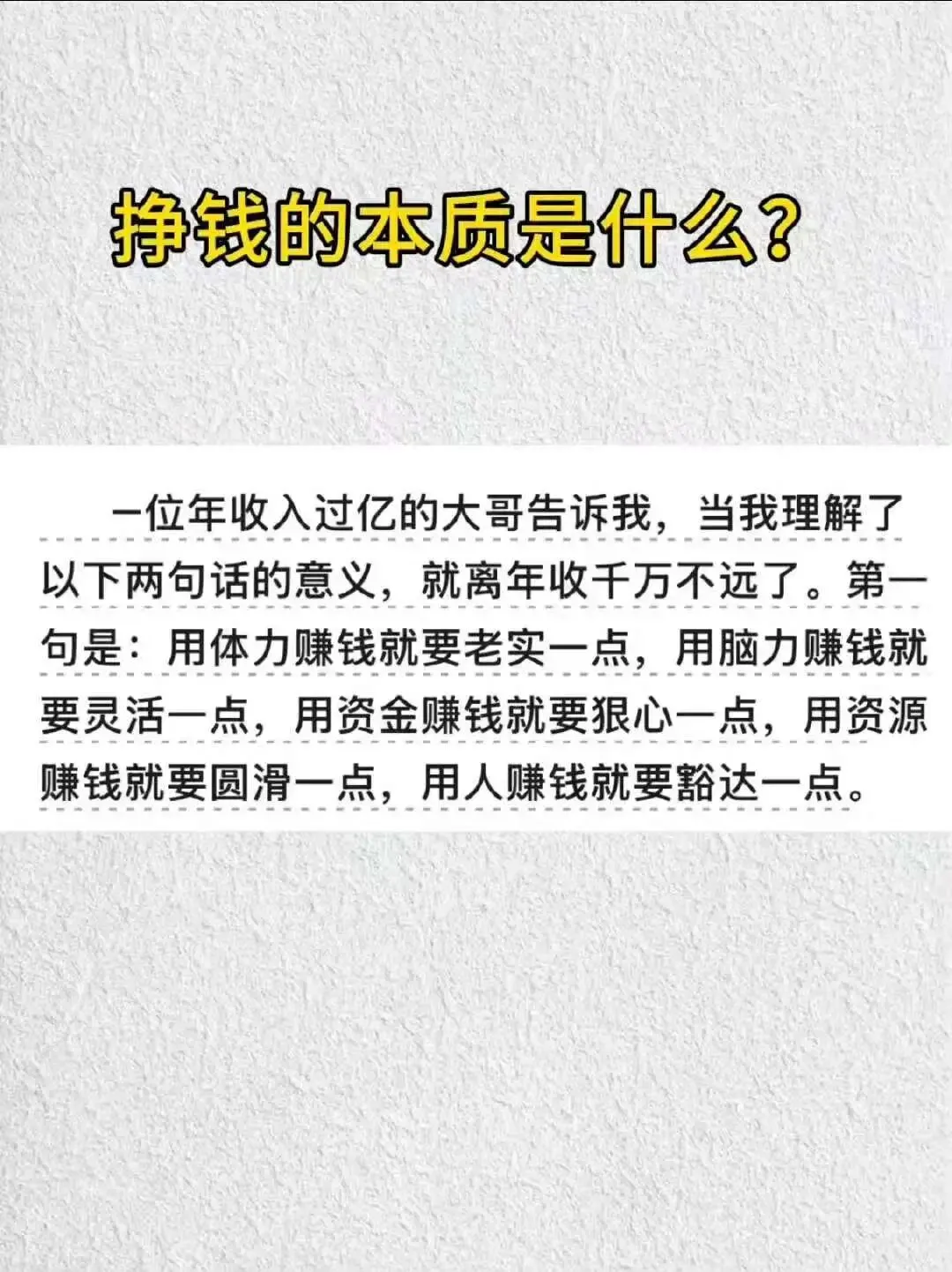 说白了就是一句话:一个人,既能赚钱,又能让钱赚钱,还能长期坚持下去。未来10年,要么成为这样的人,要么尽量靠近这样的人。
