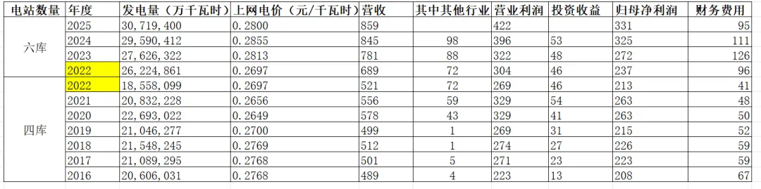 劣势:1、来水丰枯会影响发电量,从而影响利润。2016——2022四库时代,最低18558,最高22693,最高差距22%。