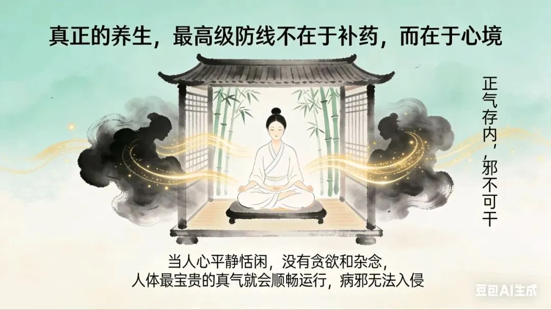当人心平静恬闲,没有贪欲和杂念,人体最宝贵的真气就会顺畅运行,病邪无法入侵,这就是中医常说的正气存内,邪不可干。