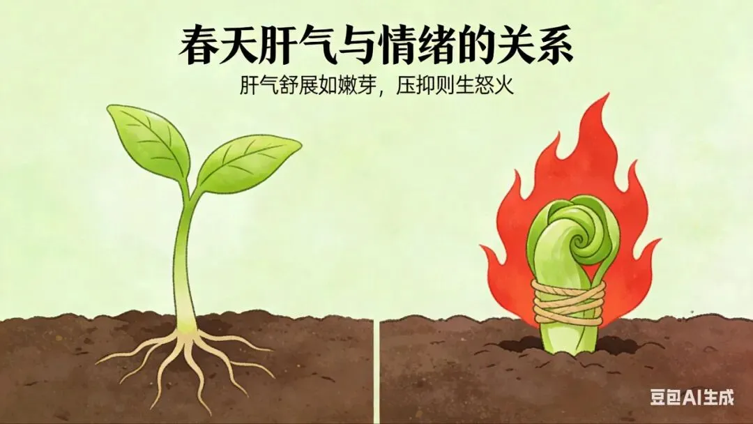 春天是生发的季节,如果肝气被压抑,不能像春天嫩芽一样舒展,就会转化为无名的怒火。