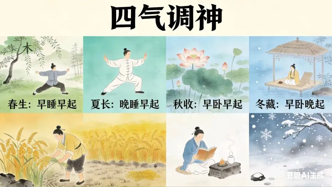 四气调神告诉我们要顺应春夏秋冬四个季节的节奏,调整神气与作息。