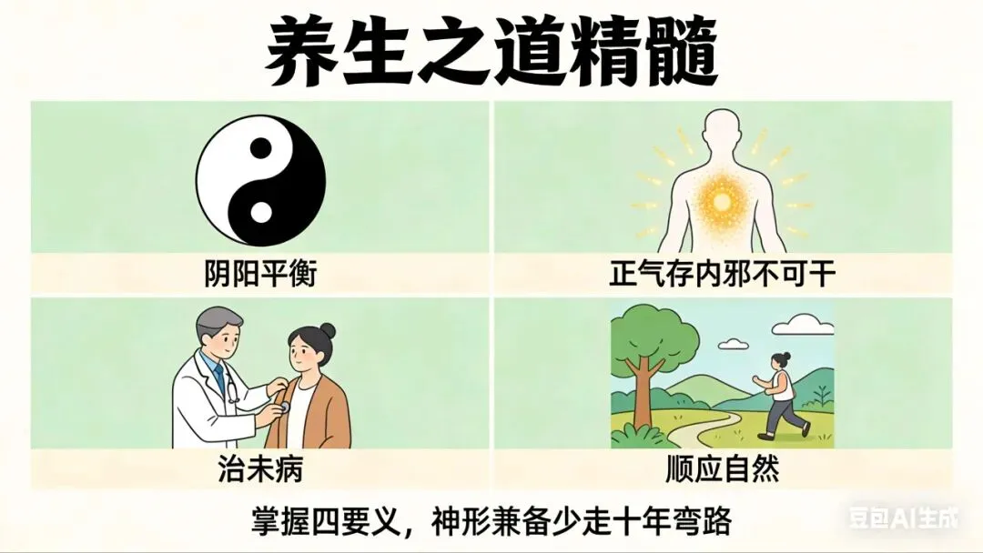 读懂其中四句核心要义——阴阳平衡、正气存内邪不可干、治未病、顺应自然,便能掌握养生之道的精髓,神形兼备,少走十年弯路。