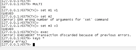 事务中如果有一条命令执行失败,其后的命令仍然会被执行,没有回滚