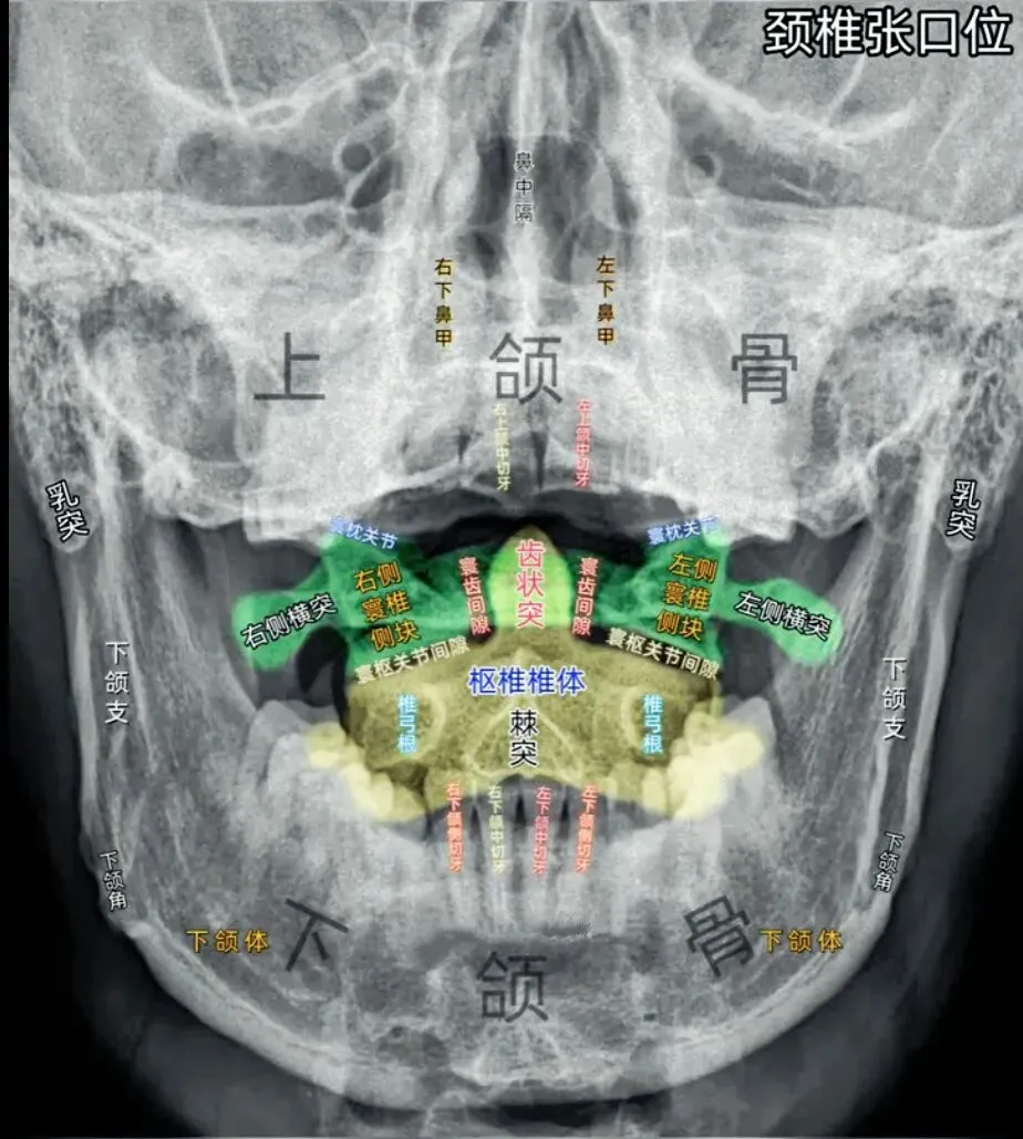 十张口是指寰枢椎的结构和位置关系,我们主要观察寰齿间隙和寰枢关节间隙及寰椎侧块的大小,来判断寰枢关节有无脱位的情况。