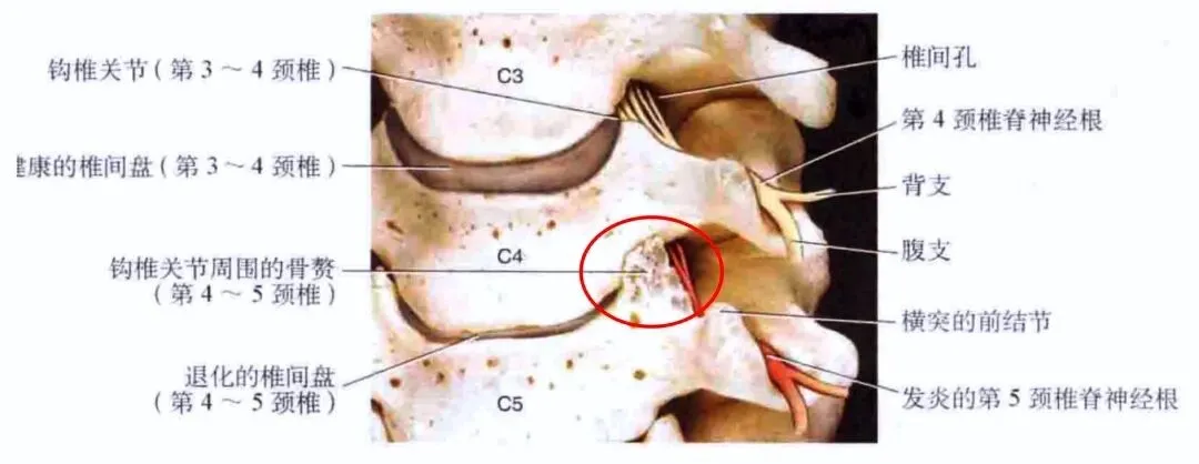 因为钩突离椎间孔非常近,所以当钩突退变发生增生肥大、变尖形成骨刺等变化时会引起相邻椎间孔、横突孔、椎管的狭窄,使得颈神经根、椎动脉和脊髓受压,引起相应的颈椎病症状和体征。