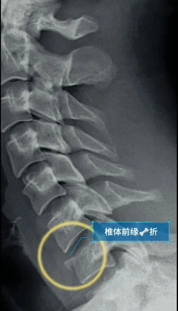 需要鉴别的类似影像有,颈椎椎体前缘骨折,骨折断茬明显且边缘较锐利,有明确外伤;