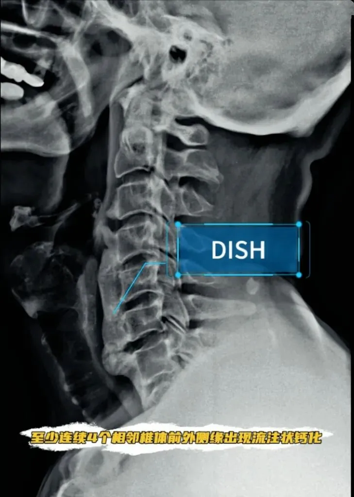 弥漫性特发性骨肥厚,至少连续四个相邻椎体前外侧缘出现流柱状钙化或骨化。