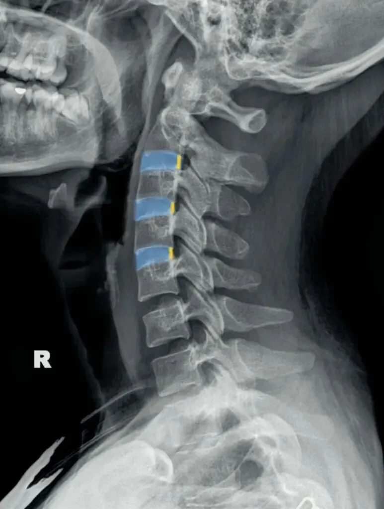 而椎间盘则为前高后低,因此颈椎的生理性前凸是由椎间盘的前高后低所形成的。在正常情况下,C23、C34和C45间隙大致相等,椎间隙前部为3.8毫米正负0.5毫米,