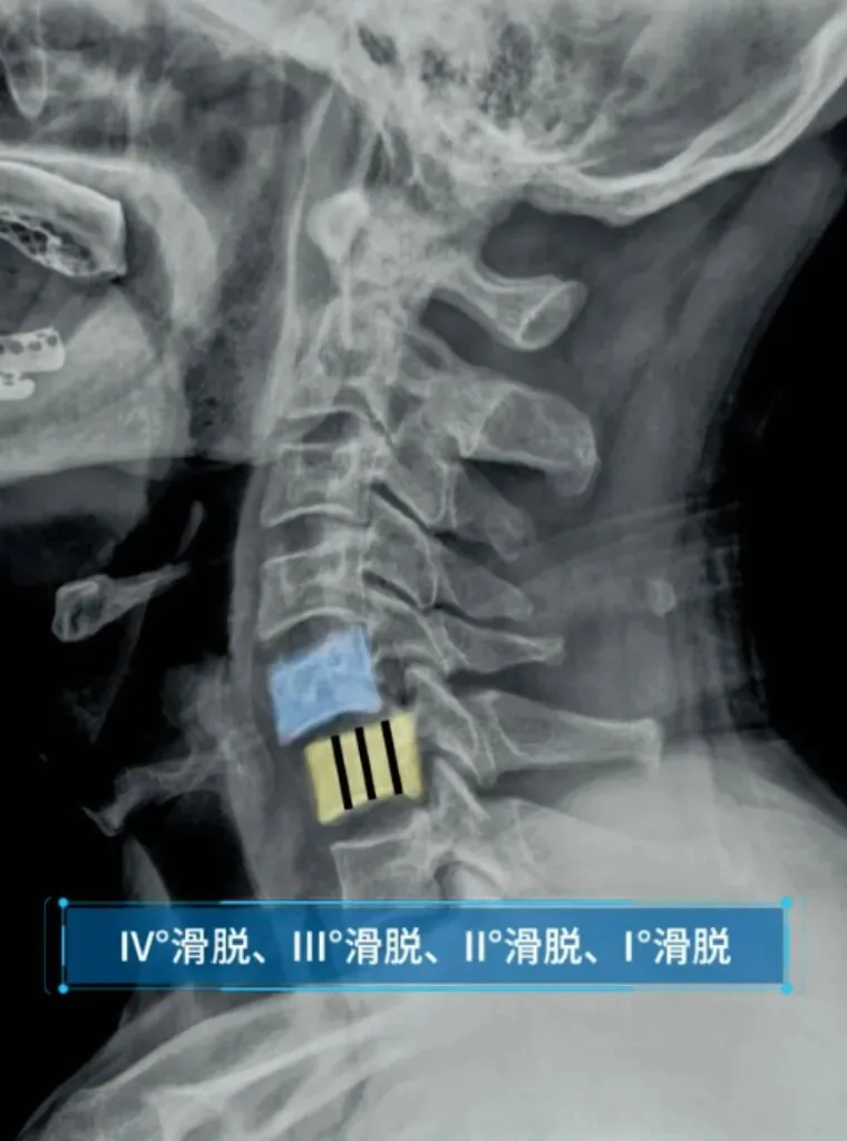 七滑脱是指颈椎椎体的滑脱,以下位椎体分为四等份,以此判断上位椎体向前或者向后的滑脱程度,