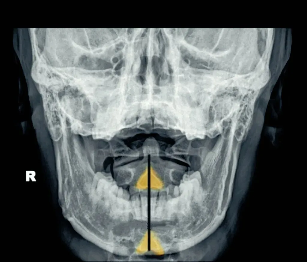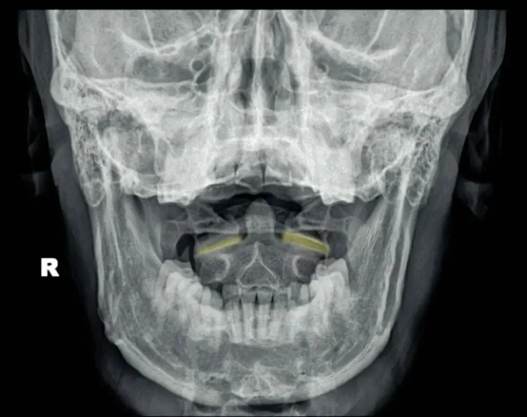 接下来是寰枢关节间隙,也称寰枢外侧关节,主要看两侧间隙是否等大,