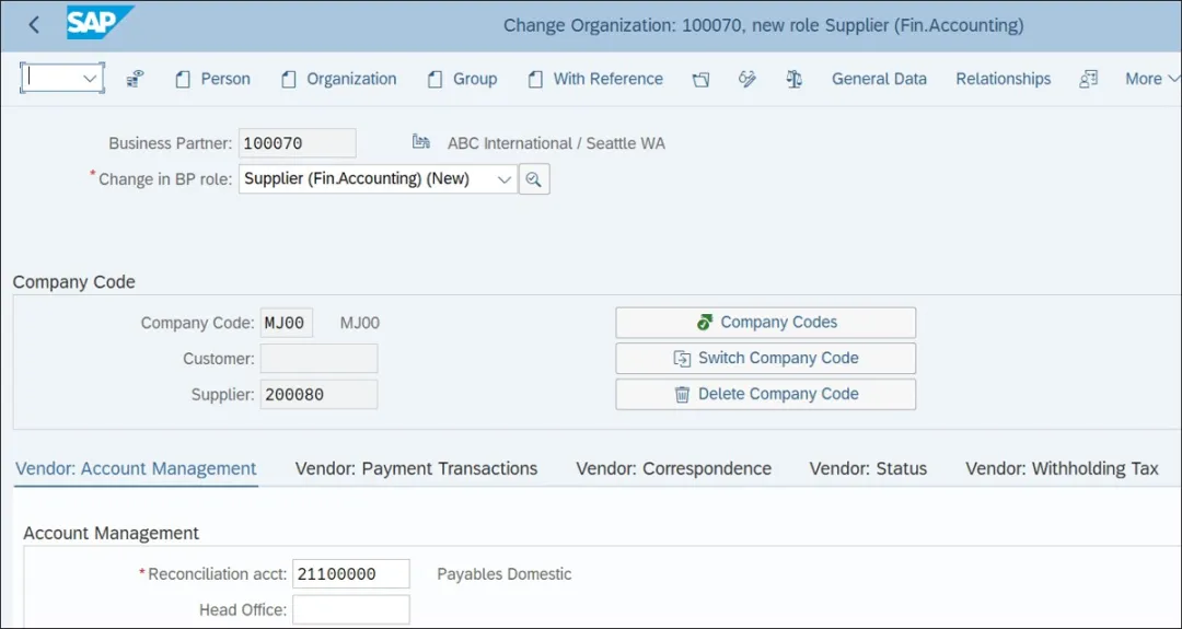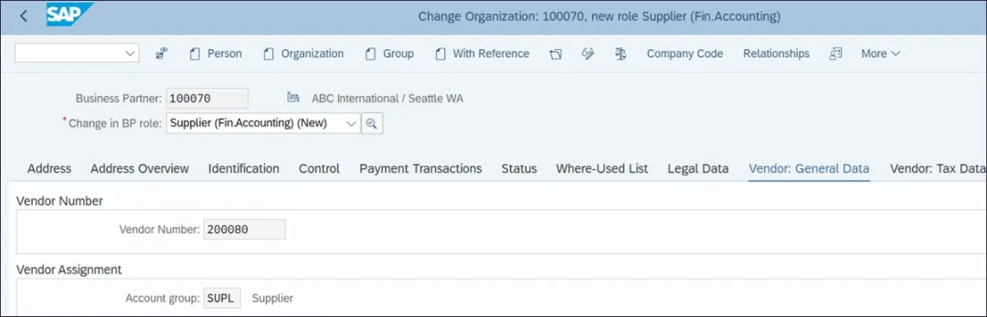 要维护额外的业务合作伙伴角色,请执行事务 BP 并以更改/编辑模式打开之前创建的具有通用角色的业务合作伙伴。下图显示,供应商(财务会计)业务合作伙伴角色是从业务合作伙伴通用角色视图中手动选择的。