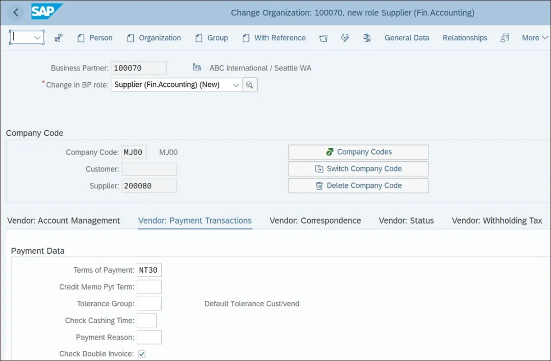 系统会显示与供应商(财务会计)角色对应的视图。如您所见,此处有公司代码按钮,用于维护供应商的财务数据。系统还会添加“供应商:通用数据”和“供应商:税务数据”选项卡,如上图所示。从“供应商:通用数据”视图中,点击屏幕顶部的“公司代码”,以维护财务供应商角色的财务会计数据。供应商的财务数据是在公司代码级别创建的。上图显示了业务合作伙伴的财务供应商角色的“供应商:账户管理”视图。“供应商:账户管理”视图中有一个关键字段:统驭科目。统驭科目是一种特殊类型的总账科目,用于将应付账款和应收账款等明细分类账集成到总账科目中。它们确保记录在明细分类账中的所有财务交易都能自动反映在总账科目中。这些科目在 SAP S/4HANA 中进行配置,以维护财务数据的完整性。必须在此字段中分配供应商统驭科目。所有与供应商相关的财务交易都记录在供应商统驭科目中。在过账供应商发票时,SAP S/4HANA 会使用欠供应商的未结金额更新应付账款明细分类账,并自动将分录过账到总账中的供应商统驭科目。上图显示了业务合作伙伴的财务供应商角色的“供应商:付款交易”视图。付款条件包含有关传入(供应商)发票的折扣计算和到期日计算的详细信息。付款条件是采购组织与供应商之间达成一致的条款。财务供应商角色的付款条件会复制到供应商发票文档中。在此字段中维护付款条件。勾选此指标是一种最佳实践,可确保在传入发票过账(物流发票验证)期间进行重复检查。在物流发票验证期间,会根据以下内容进行重复发票检查,以查找任何潜在的重复发票:在采购组织级别维护的供应商角色是创建采购文档(采购订单、框架协议等)所必需的,而在公司代码级别维护的财务供应商角色是过账供应商传入发票所必需的。你若喜欢,点个❤️谢先👇