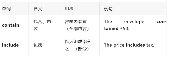 记忆:contain强调"整体全部在内",include强调"作为组成部分"。