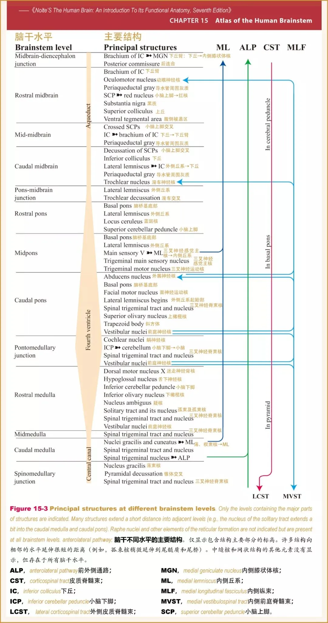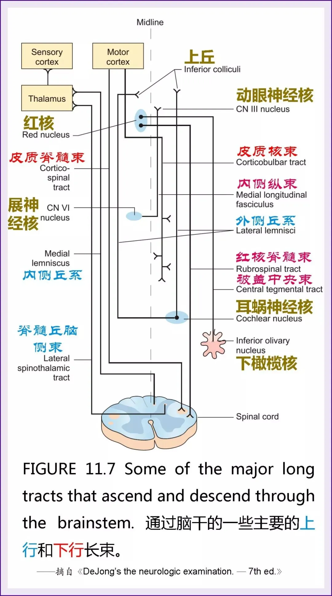 7、内侧纵束(MLF,mediallongitudinal fasciculus)。这种纤维束延伸整个脑干的长度,在不同水平层面上其纤维成分有所不同。