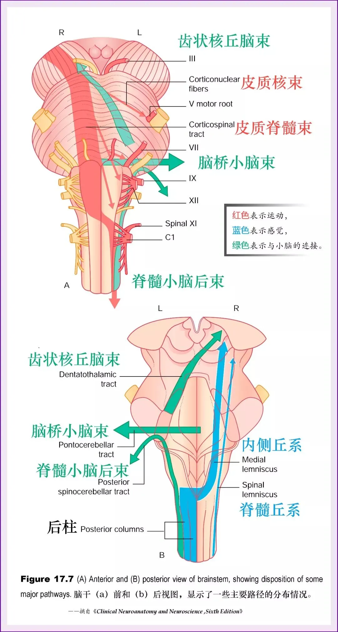 3、在脑干brainstem内:来自皮层终止于脑干的锥体束纤维是皮质核束corticonucleartract。如图17.3所示,它们分布于躯体运动核和鳃运动核时以对侧为主,分布于躯体感觉核时完全为对侧。