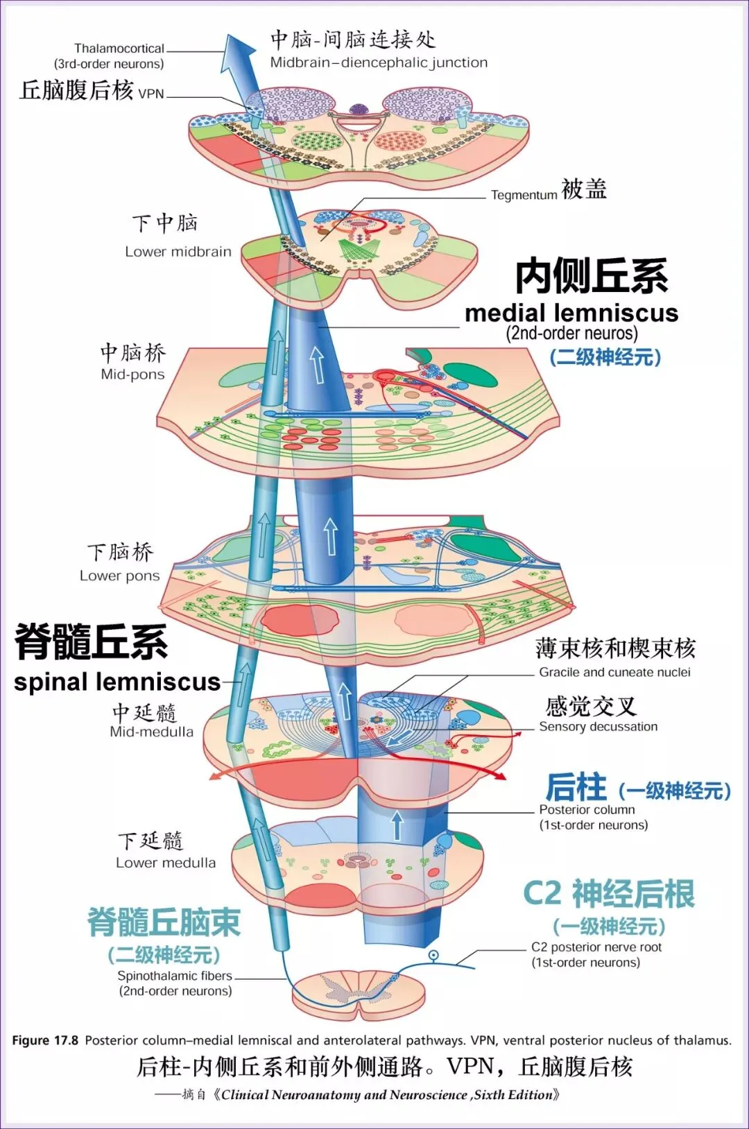从脊髓上行至丘脑的2个丘系(内侧丘系、脊髓丘系);