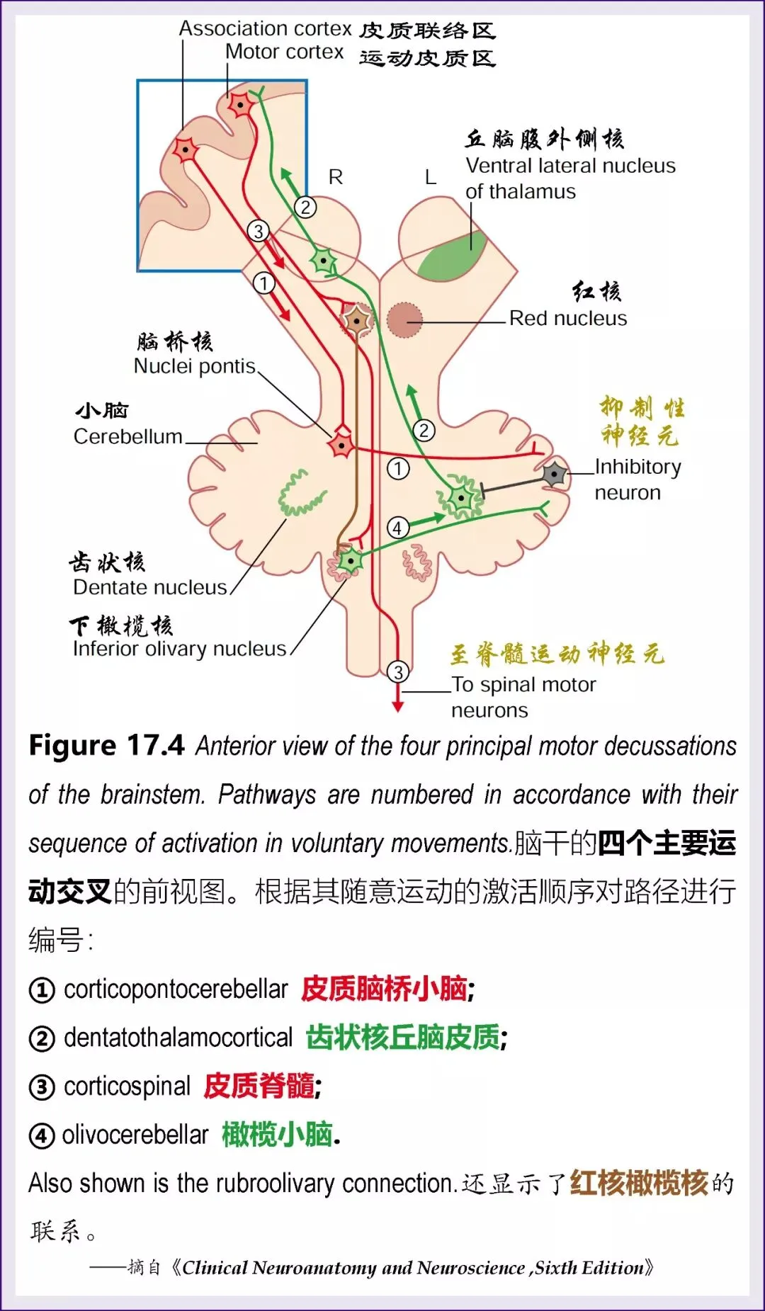 5、为了基本了解脑干中的神经关系,还必须了解大脑半球cerebralhemisphere与下橄榄核inferior olivarynucleus和小脑cerebellum的联系。