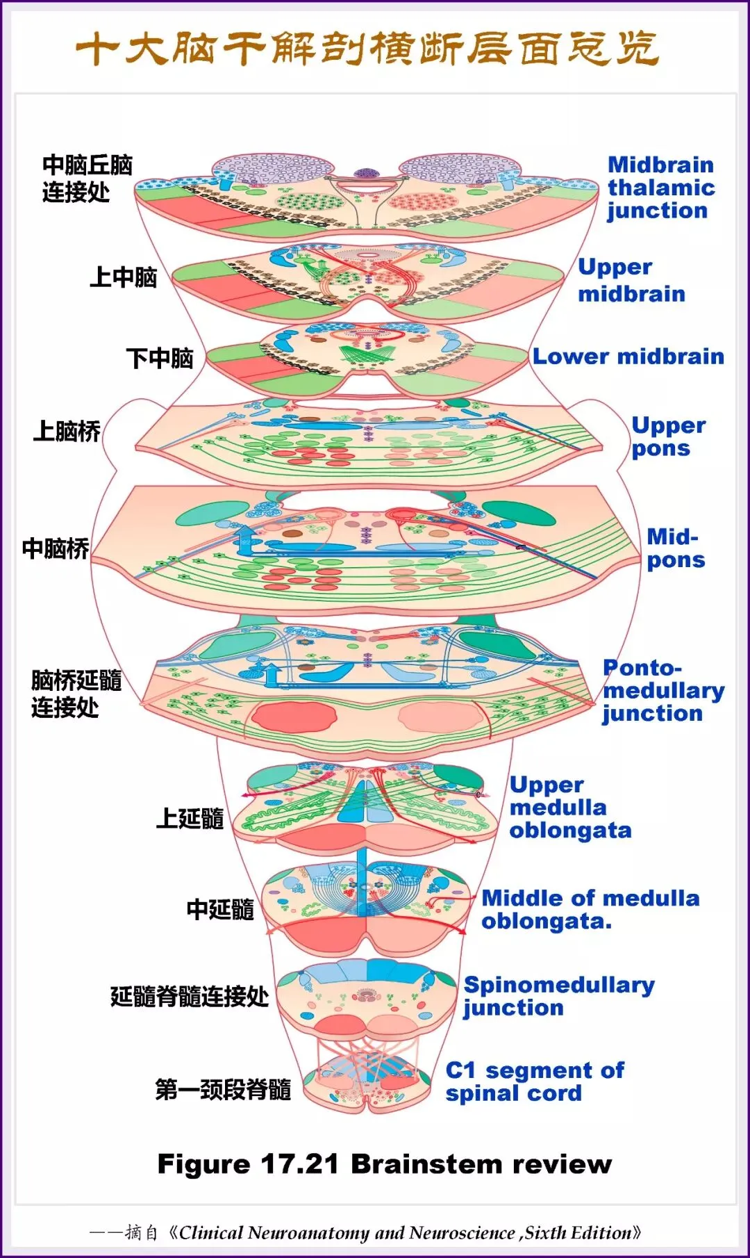 2、学习起来分两块:①上行、下行传导束以及各种交叉的名称、功能、具体断层位置。②神经核(根据按具体类似神经功能对神经核进行分组学习,如:a,视觉和眼球运动相关;b,头面部感觉相关;c,吞咽摄食相关;d,呼吸循环相关;e,觉醒状态相关)。